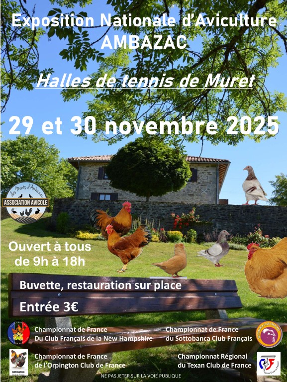 29-30. Ambazac (87). Nationale organisée par l'Association avicole des Monts d'Ambazac. Championnat de France de la poule ORPINGTON. Championnat de France de la poule NEW HAMPSHIRE. Championnat de France du pigeon SOTTOBANCA.
