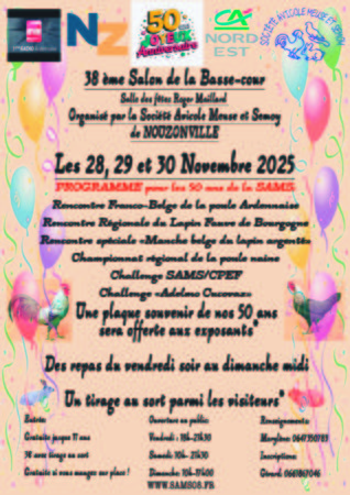 27, 28 et 29 novembre. Nouzonville (08). Exposition Nationale organisée par la Société Avicole Meuse Semoy. Championnat régional du lapin fauve de bourgogne. Rencontre Franco-Belge de la poule Ardennaise. Championnat Régional Bantam Club. Manche du championnat Belge du lapin Argenté. Challenge Inter-Société S.A.M.S./C.P.E.F. Rencontre Amicale de "volailles combattantes". Vanhooren Gérard, Tel 06 61 86 70 46, E-mail vanhooren.gerard@orange.fr