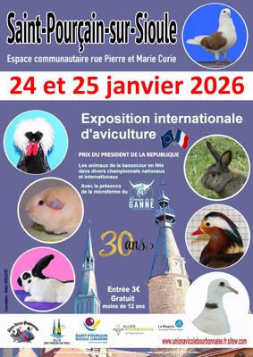 24 et 25 janvier. Saint-Pourçain-sur-Sioule (03). Exposition internationale organisée par l’union avicole bourbonnaise. Prix diu Président de la République. Championnats de France des pigeons cravates et gier. Coupes de France des volailles bourbonnaises et des lapins gris du bourbonnais. Rencontre internationale et coupe de France de la tourterelle rieuse. Manche franco-belge des oiseaux d’ornement (tcg club - belgique). Championnat régional des poules brahma. Souvenirs : jean-michel doriol (pigeon texan), jean-françois sanvoisin (poule bourbonnaise), jean bourret (palmipèdes) et andré job (lapins). Partenaire officiel de la course aux points pour les lapins. Vincent Cheradame, tél. 06 63 47 40 57, e-mail vincentcheradame@live.fr