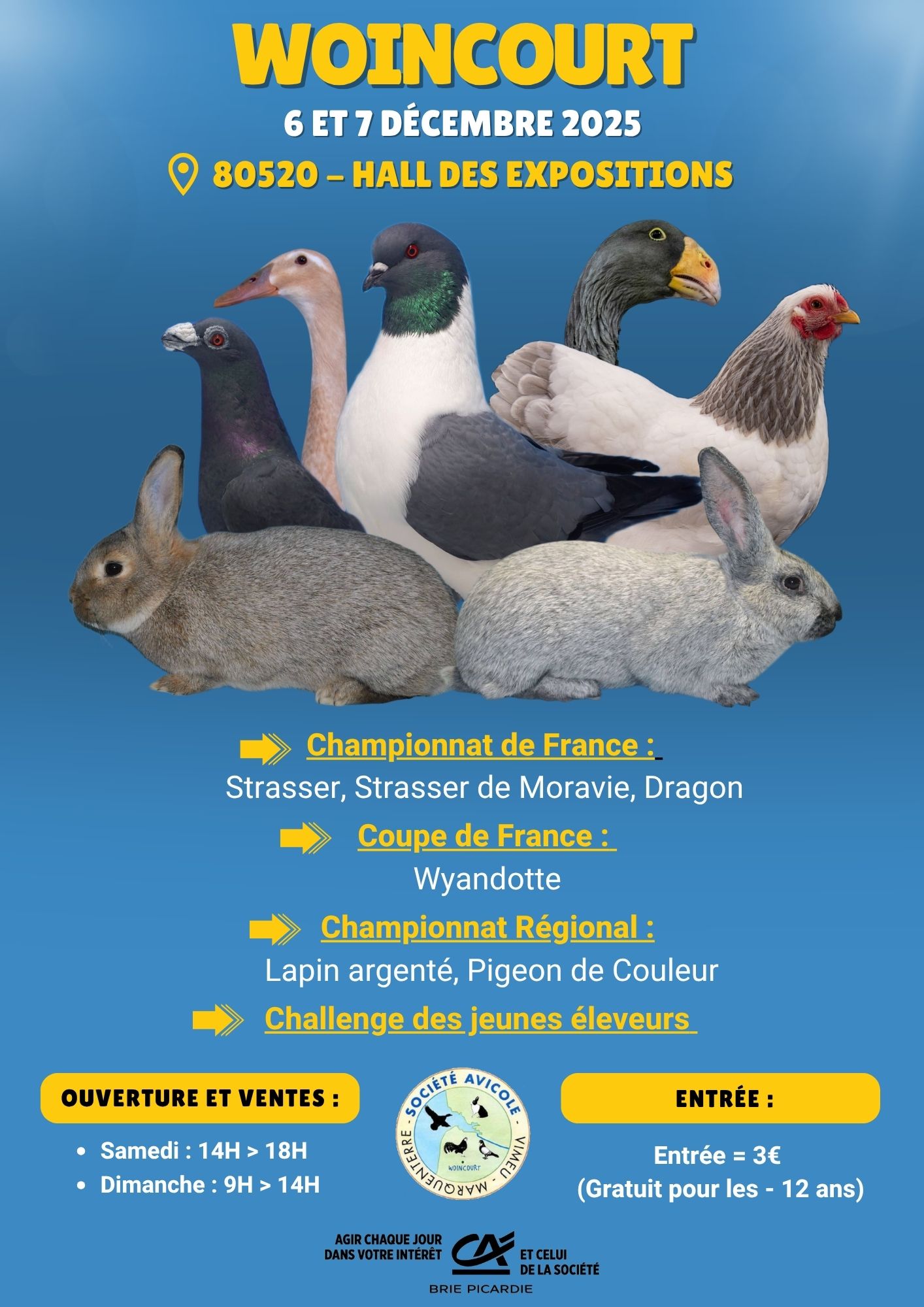 6 et 7 décembre. Woincourt (80). Exposition nationale organisée par la Société Avicole Vimeu Marquenterre. Championnat de France du Strasser, Strasser de Moravie et Dragon. Coupe de France de la Wyandotte. Championnat régional lapins Argenté, pigeon de couleur. Challenge des jeunes éleveurs. Inscription en ligne sur https://expositions-aviculture.fr Enlogement vendredi après-midi et délogement dimanche à 14h. Aymeric Amourette tél 06 15 64 01 67 E-mail savm80520@hotmail.fr